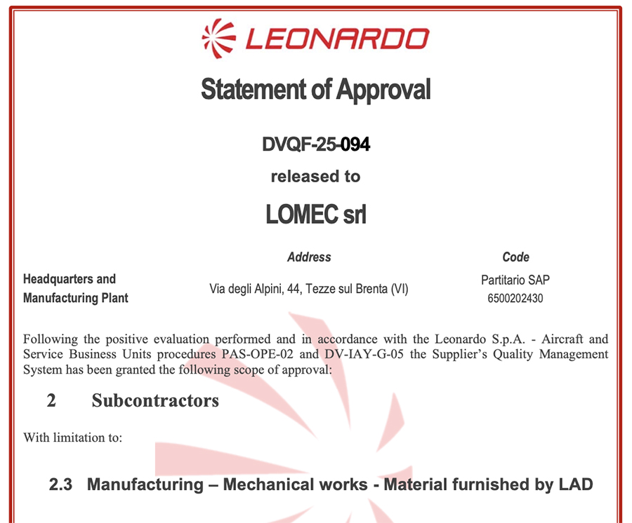 Per questo motivo la qualifica ottenuta da Lomec Aerospace comefornitore certificato di Leonardo S.p.A. per la Leonardo Aeronautics Division (Divisione Velivoli) rappresenta un traguardo di grande rilievo nel percorso di crescita dell’azienda.